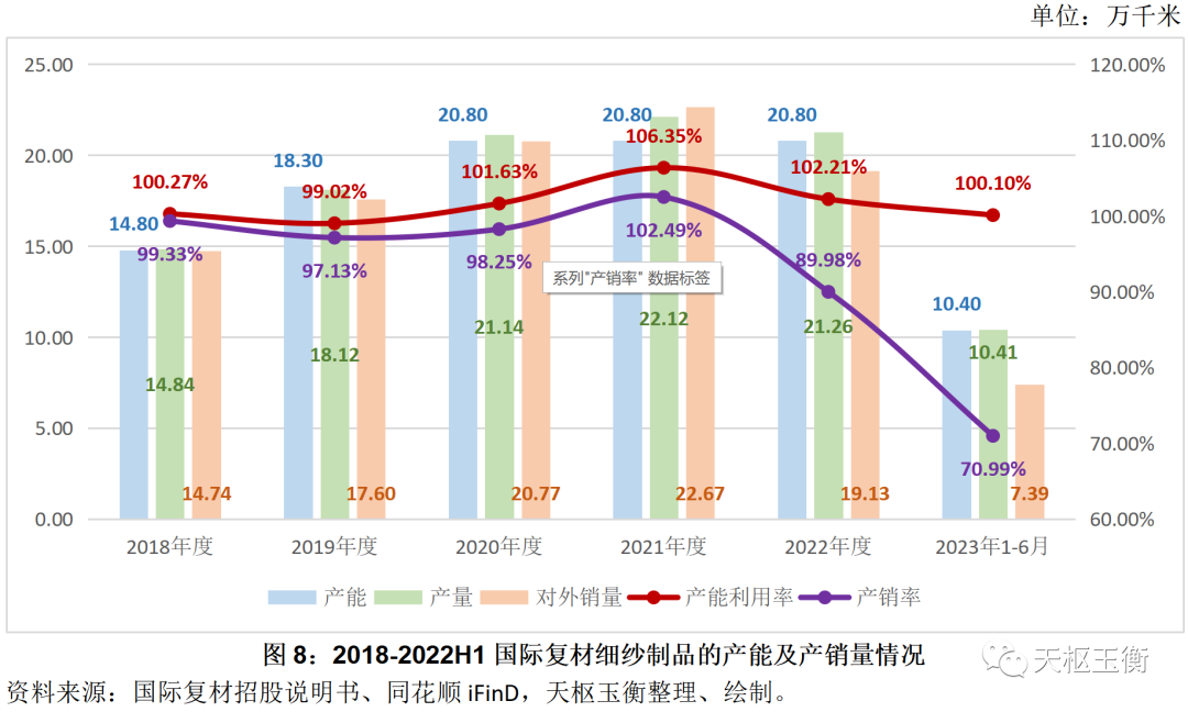在細紗制品方面,2022年國際復材生產(chǎn)細紗制品20.80萬千米,產(chǎn)能利用率為102.21%;銷量21.26萬千米,產(chǎn)銷率為89.98%。