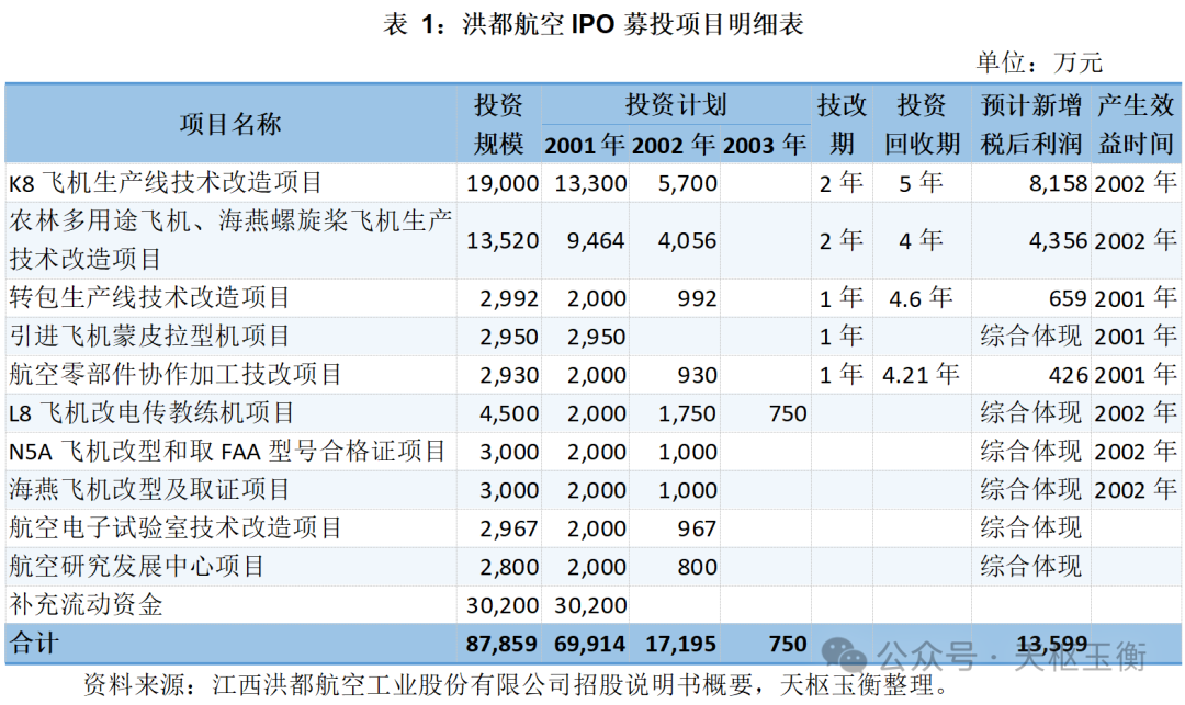 2000年11月16日,洪都航空發(fā)行了首期A股股票,成功在A股上市。洪都航空IPO發(fā)行預(yù)計(jì)募集資金89,880萬元,扣除發(fā)行費(fèi)用后,公司實(shí)際募集資金為873,988,774.22元。各募投項(xiàng)目的投資規(guī)模及投資回收期如下表所示: