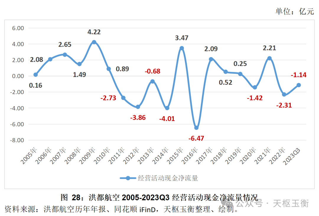 此外,2005年至2023年三季度末,19年間,洪都航空有9年的經(jīng)營活動現(xiàn)金都呈現(xiàn)凈流出的情況。