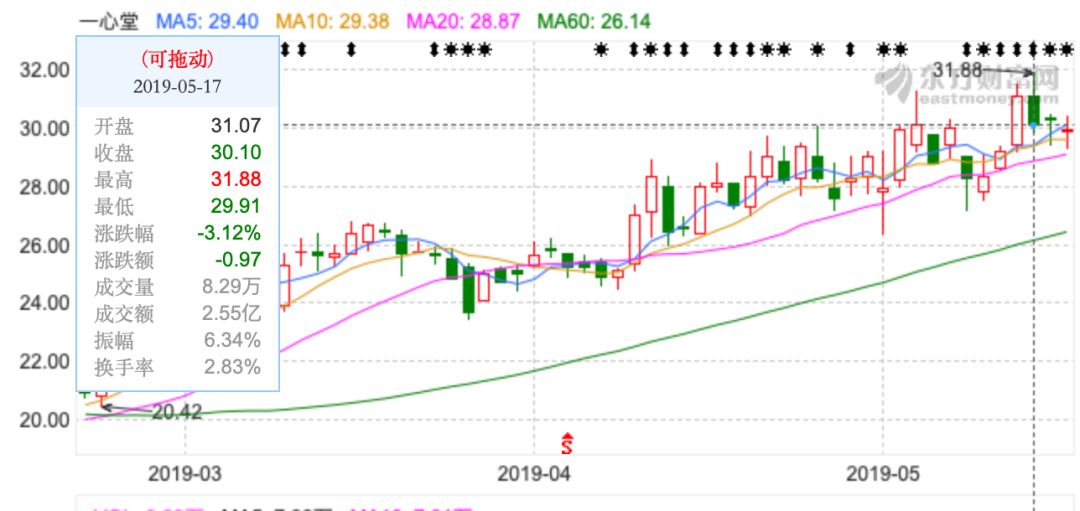 一心轉(zhuǎn)債上市當(dāng)日開盤即報(bào)119.989元,較100元掛牌價(jià)上漲19.99%,最終收于116.70元。同日,一心堂股票一度上漲至31.88元/股,為去年8月以來的峰值。