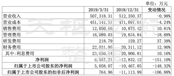 2019年一季度,云鋁股份營業(yè)收入雖較去年同期小幅下滑,但在凈利潤方面,公司2018年同期歸屬于上市公司股東的凈利潤虧損1.05億元,今年則盈利5,058.07萬元。