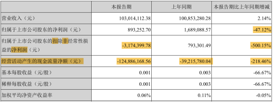 云南鍺業(yè)2019年一季度完成營業(yè)收入1.03億元,較去年同期上漲2.14%,然而,歸屬于上市公司股東的凈利潤則較去年同期下跌了近50%,僅盈利89.33萬元,且扣非后凈利潤317.44萬元。