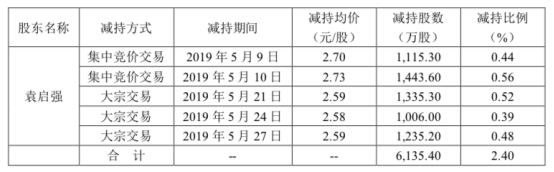公司股東袁啟強(qiáng)先生持有公司股份210,236,653股,占公司總股本比例8.21%。截止目前,袁啟強(qiáng)先生共減持公司股份6,135.40萬股,減持公司股份數(shù)量較其預(yù)披露減持計(jì)劃數(shù)量已過半。具體減持情況如下:
