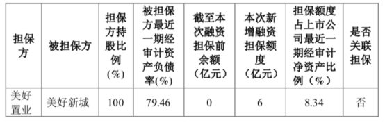 經(jīng)公司2018年年度股東大會(huì)批準(zhǔn),公司可為美好新城提供的擔(dān)保額度為8億元。本次擔(dān)保提供前,已使用擔(dān)保余額為0億元。經(jīng)公司總裁辦公會(huì)審議,董事長審批,同意本次使用擔(dān)保額度6億元,累計(jì)使用額度6億元,剩余可用擔(dān)保額度為2億元。