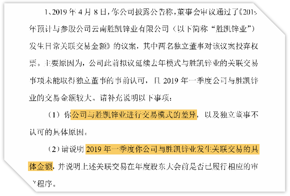 除此之外,羅平鋅電于勝凱鋅業(yè)的關(guān)聯(lián)交易日前也受到了云南證監(jiān)局的關(guān)注。但就關(guān)鍵信息仍然未作出準確回應。