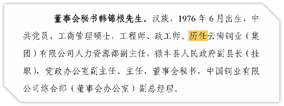 此外,彭捍東先生不再擔(dān)任云南銅業(yè)董事會(huì)秘書兼證券事務(wù)代表,董事會(huì)秘書一職由韓錦根先生先生擔(dān)任,證券事務(wù)代表則由孫萍女士出任。