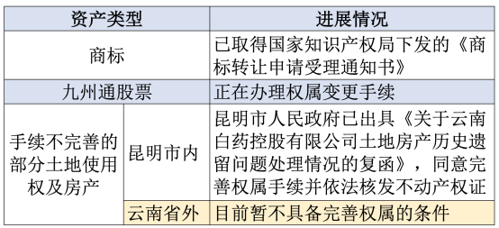 截止目前,白藥控股已按照《資產(chǎn)交割清單》,將其全部資產(chǎn)交付給云南白藥實際占有、使用、處分、收益,相關(guān)資產(chǎn)所涉及的各項權(quán)利、義務(wù)、風(fēng)險及收益均自吸并交割日起概括轉(zhuǎn)移至云南白藥,而不論該等資產(chǎn)是否已實際過戶登記至云南白藥名下。