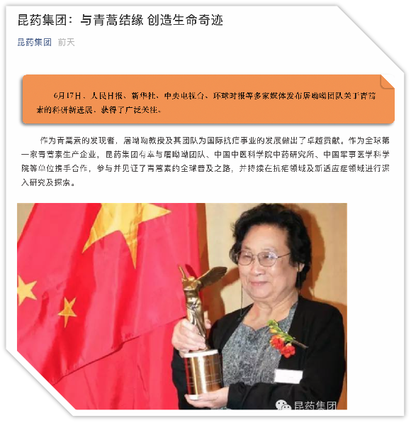 受“屠呦呦”與“青蒿素”的影響,昆藥集團于本周連續(xù)漲停,并在公司官網(wǎng)、官微上發(fā)布了名為《昆藥集團:與青蒿結(jié)緣 創(chuàng)造生命奇跡》一文,就該事件進行宣傳。