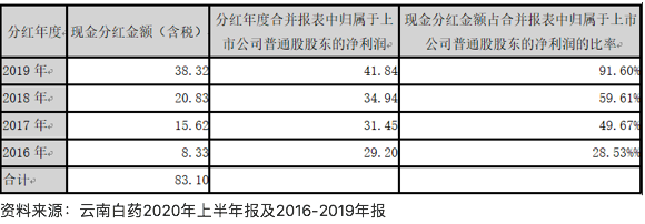 表 5:白藥控股混改后云南白藥現(xiàn)金現(xiàn)金分紅情況一覽表(單位:億元,%)