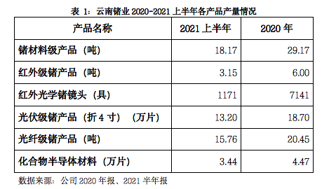 下表為云南鍺業(yè)2020年、2021上半年各產(chǎn)品產(chǎn)量情況: