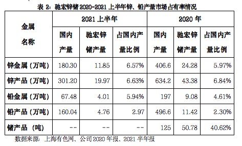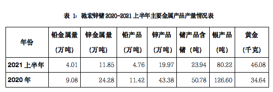 馳宏鋅鍺2020年、2021上半年主要金屬產(chǎn)品產(chǎn)量情況如下表所示: