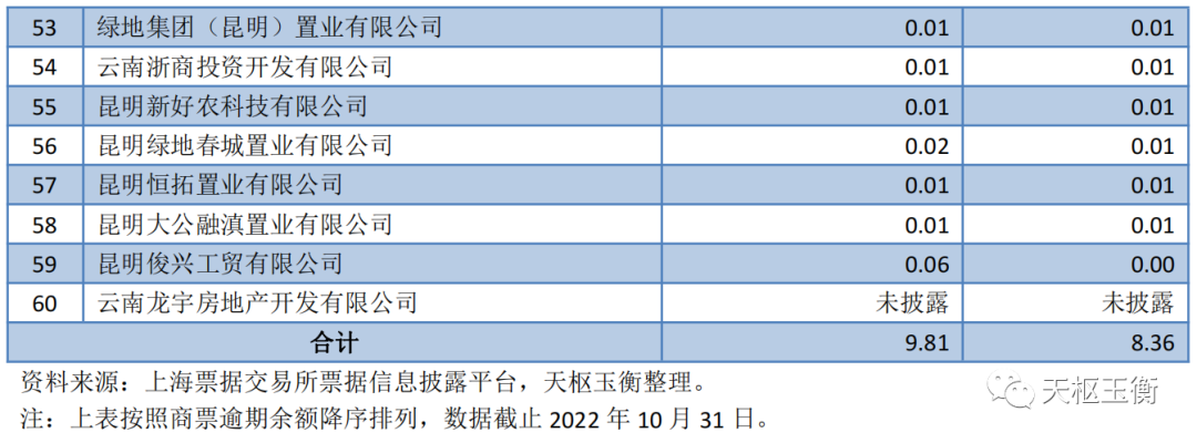 60家商票逾期企業(yè)中,截止2022年10月31日逾期余額前三的分別為昆明融創(chuàng)城投資有限公司、云南頤嶺置業(yè)有限公司和云南融科科技產(chǎn)業(yè)投資有限公司。其中,昆明融創(chuàng)城投資有限公司累計商票逾期發(fā)生額為1.06億元,截止2022年10月31日還有1.02億元的逾期余額未支付;