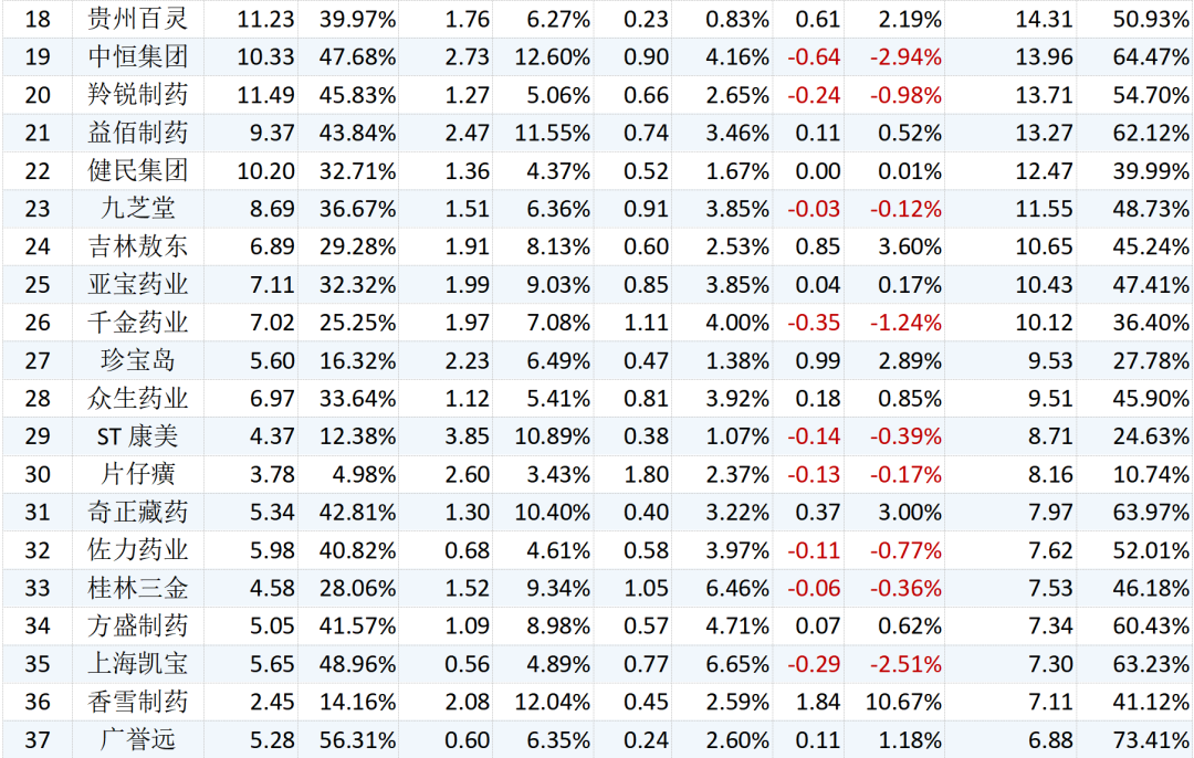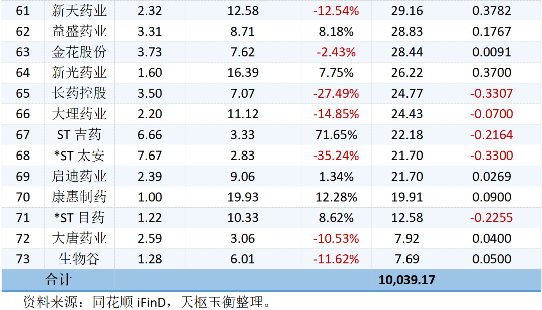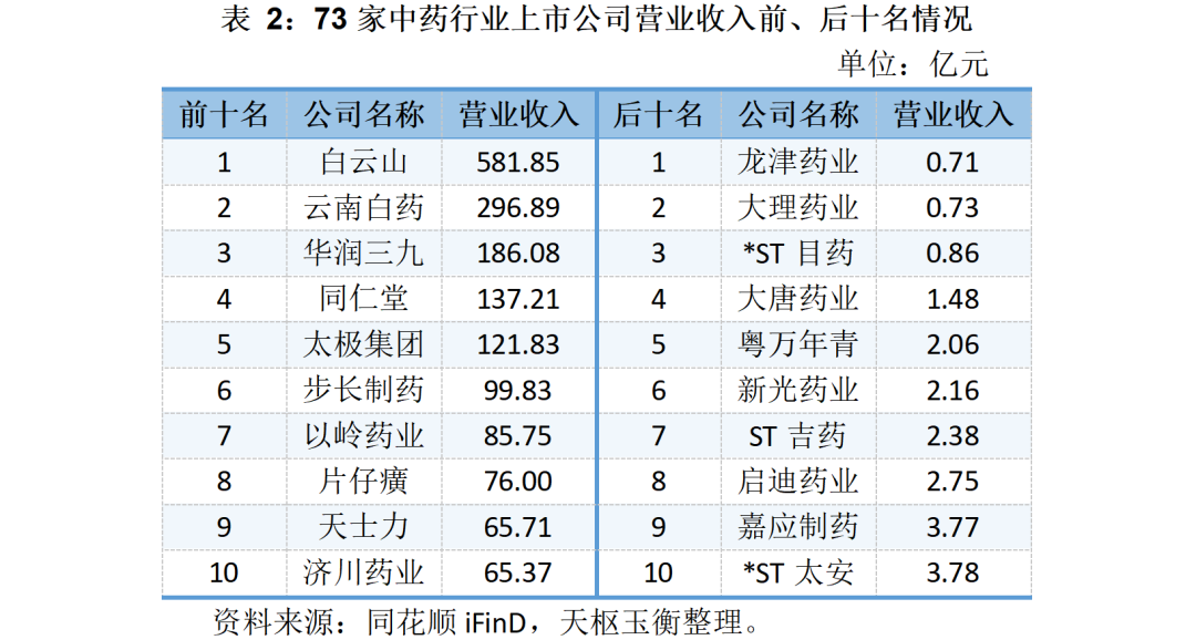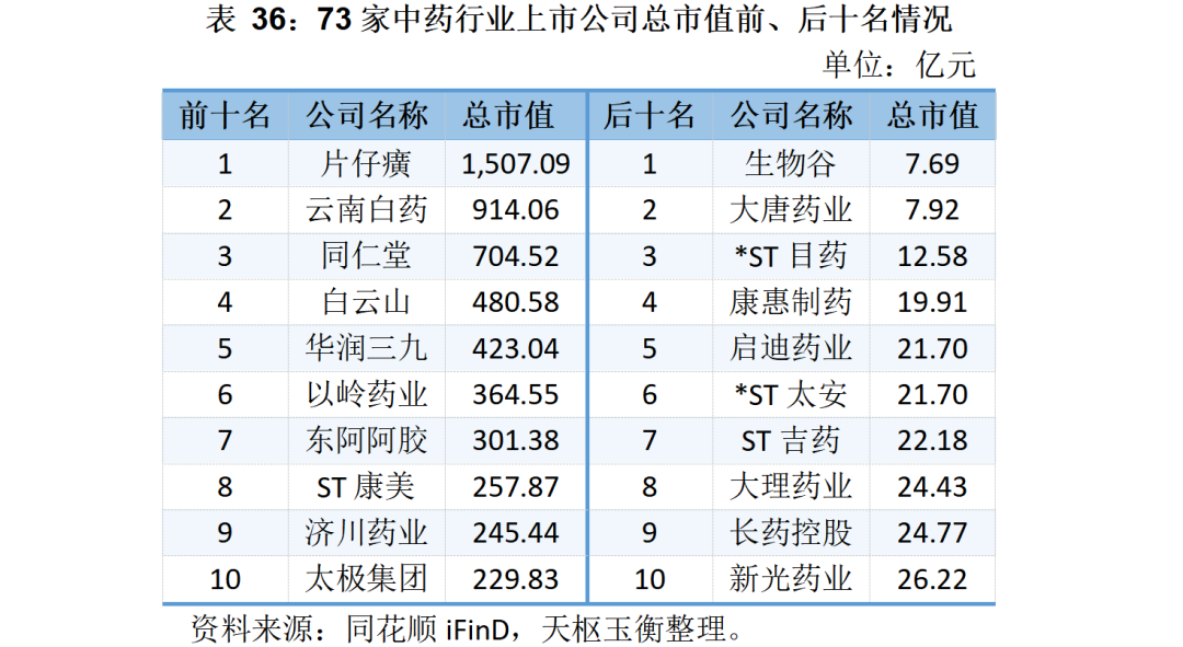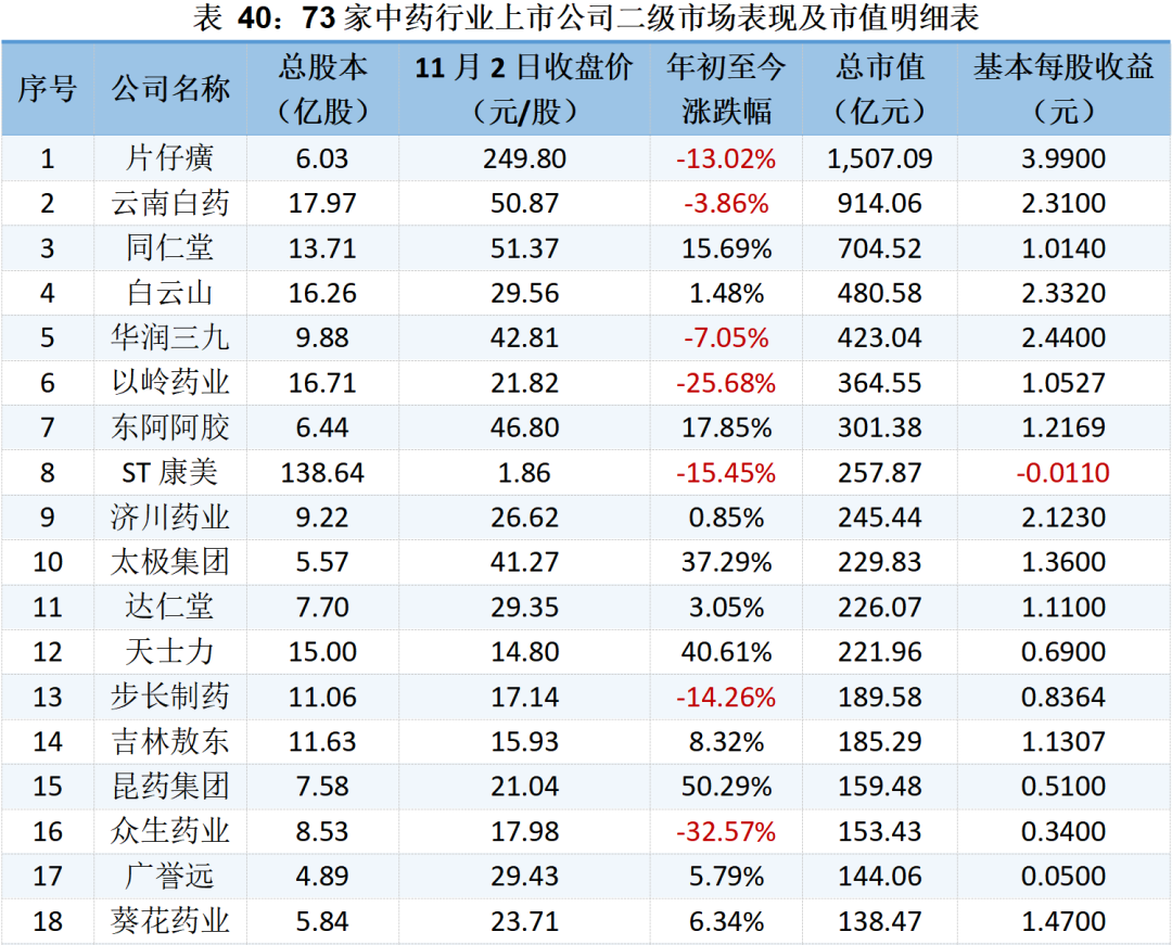 73家中藥上市公司的二級市場表現(xiàn)及市值明細如下所示: