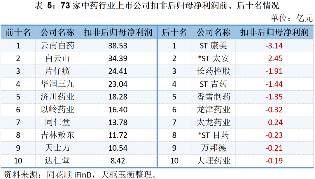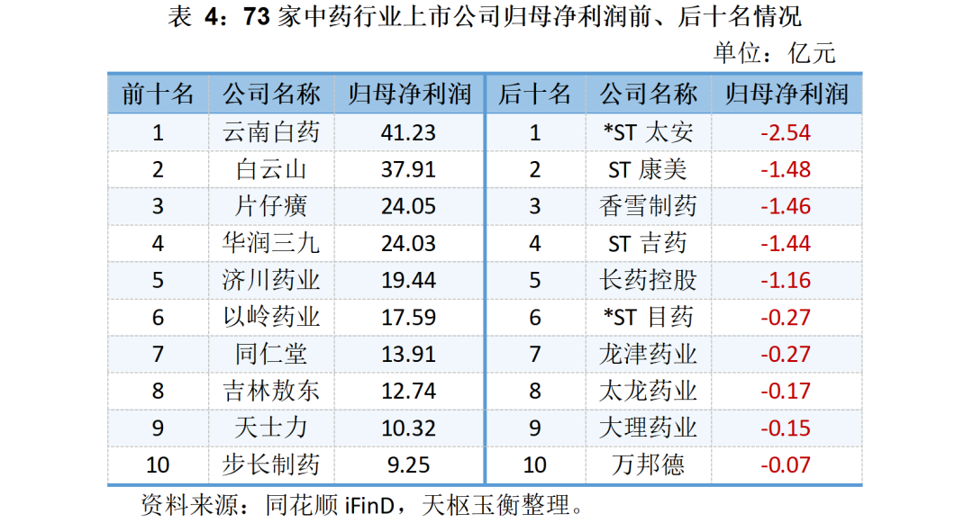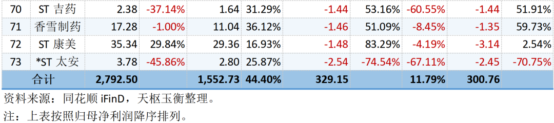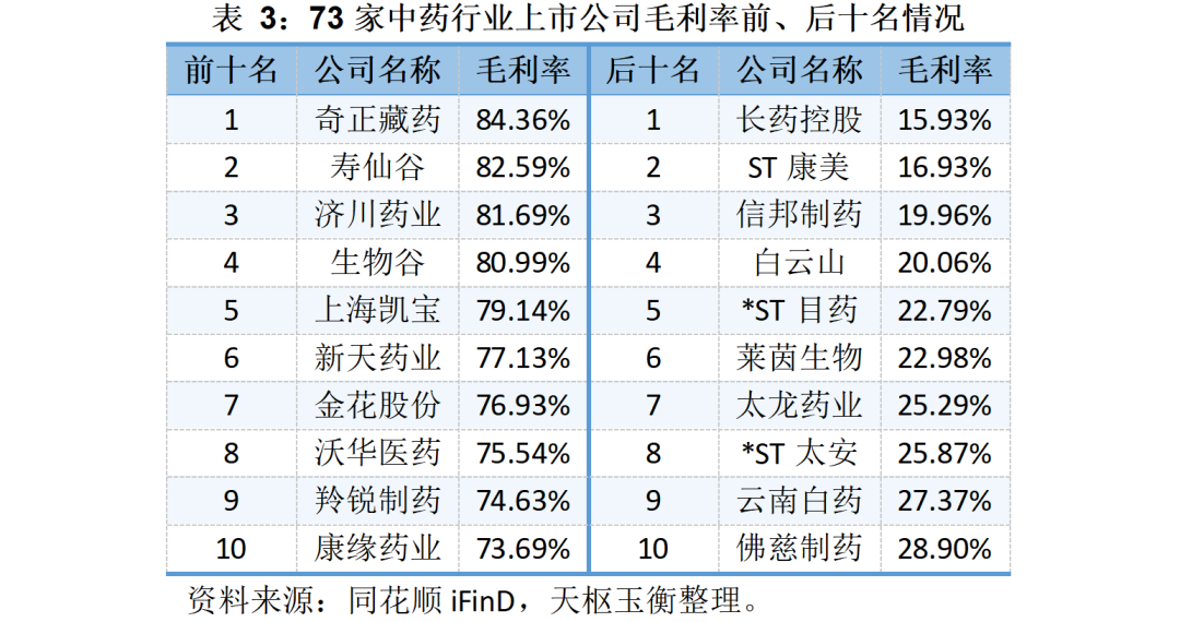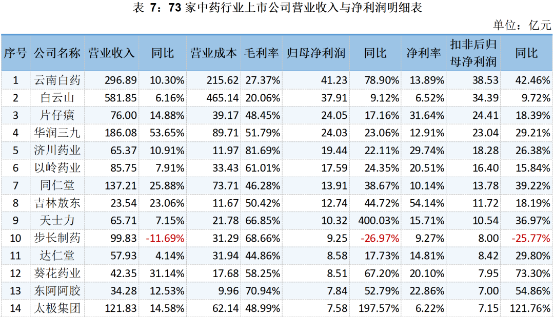 73家中藥上市公司的營收、毛利與凈利潤明細表如下所示: