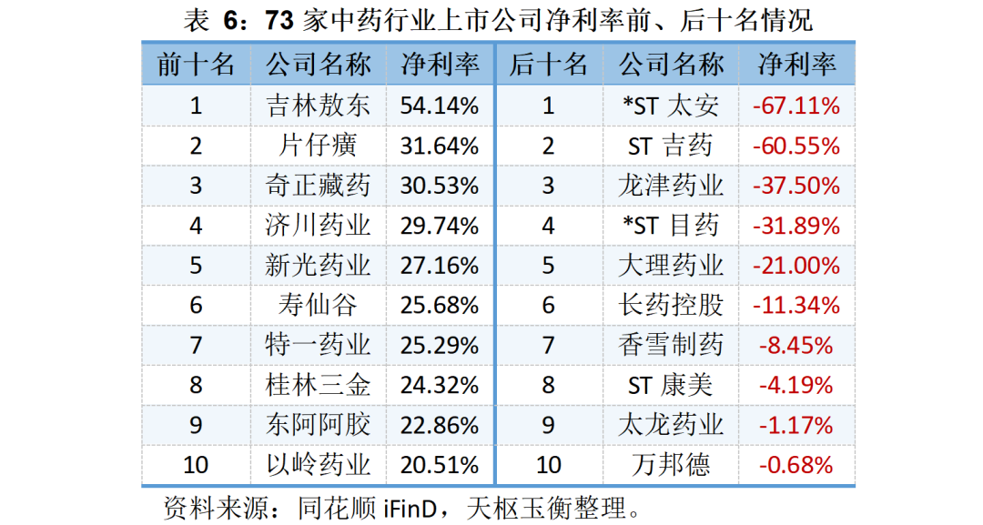 在凈利率方面,吉林敖東是唯一一家凈利率破50%的企業(yè),片仔癀和奇正藏藥的毛利率也突破了30%;*ST太安和ST吉藥的凈利率則突破了-60%。