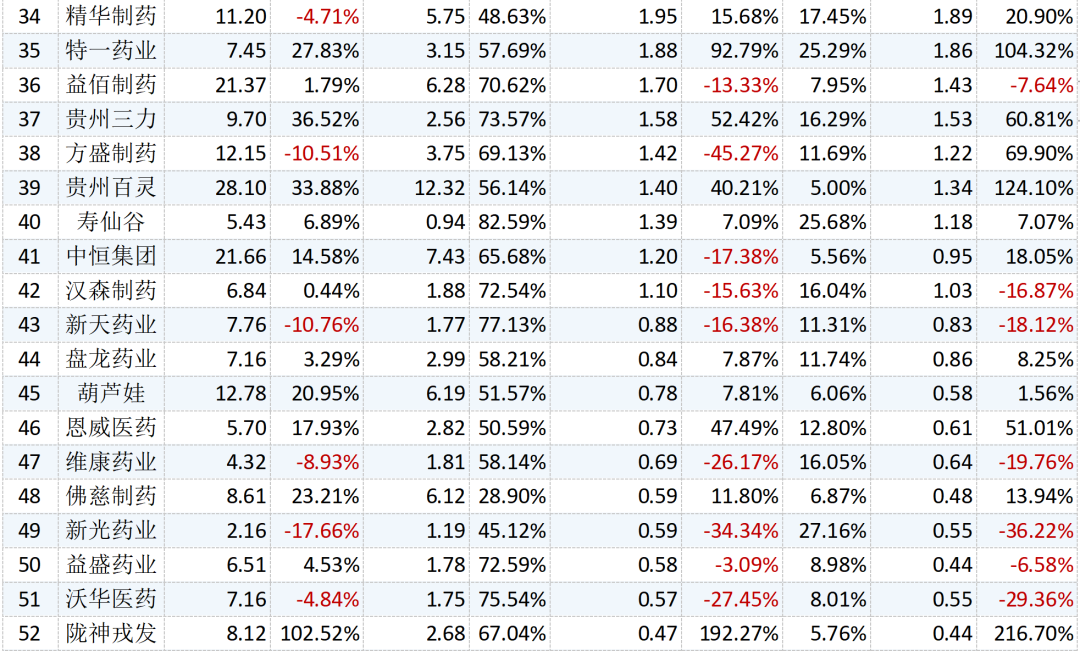 從扣非后歸母凈利潤的增速來看,50家公司扣非后歸母凈利潤實現(xiàn)增長,其中,隴神戎發(fā)的扣非后歸母凈利潤同比增長了2倍;廣譽遠、貴州百靈、太極集團、珍寶島、特一藥業(yè)、和亞寶藥業(yè)扣非后歸母凈利潤較上年同期也實現(xiàn)了超100%的增幅。