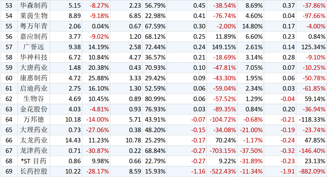 從歸母凈利潤增速來看,43家公司歸母凈利潤實現(xiàn)增長,30家公司歸母凈利潤出現(xiàn)下滑。其中,天士力同比增長超4倍,珍寶島、太極集團、隴神戎發(fā)的歸母凈利潤同比也增長了2倍左右;龍津藥業(yè)則下滑超700%,長藥控股下滑522.43%。