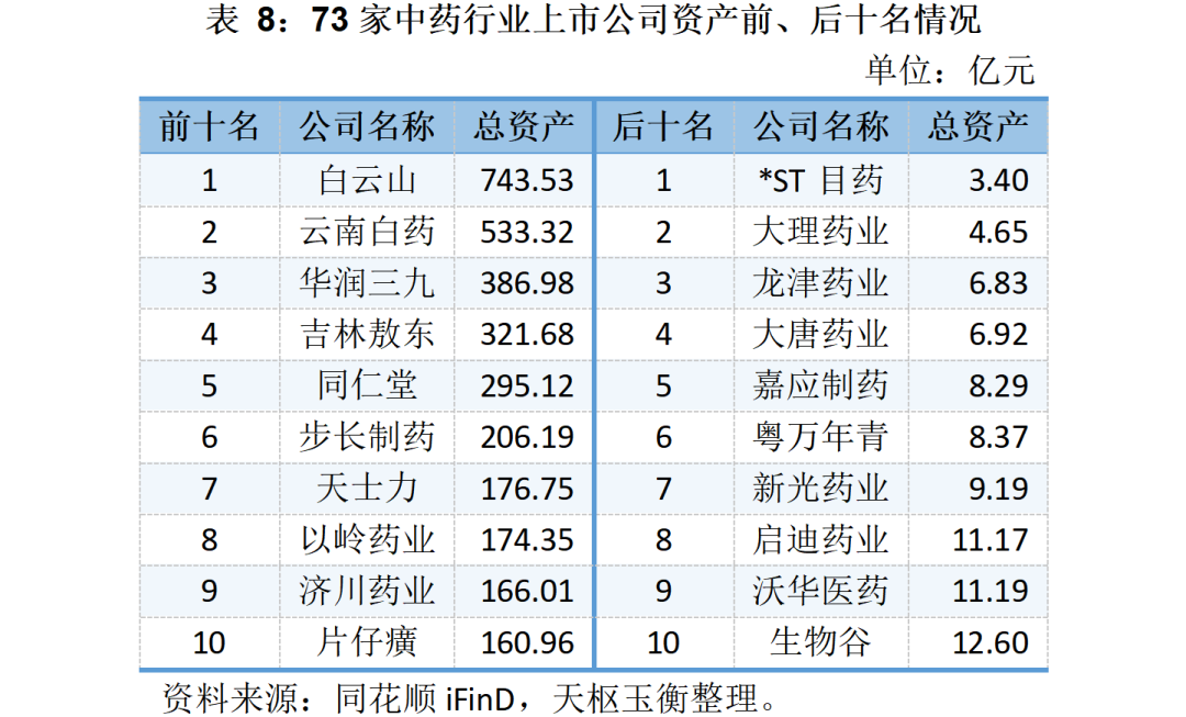 白云山以743.53億元的總資產(chǎn)排名73家中藥行業(yè)上市公司之首,云南白藥、華潤三九分別以533.32億元和386.98億元緊隨其后;*ST目藥、大理藥業(yè)、龍津藥業(yè)、大唐藥業(yè)等7家公司的總資產(chǎn)則均不足10億元。
