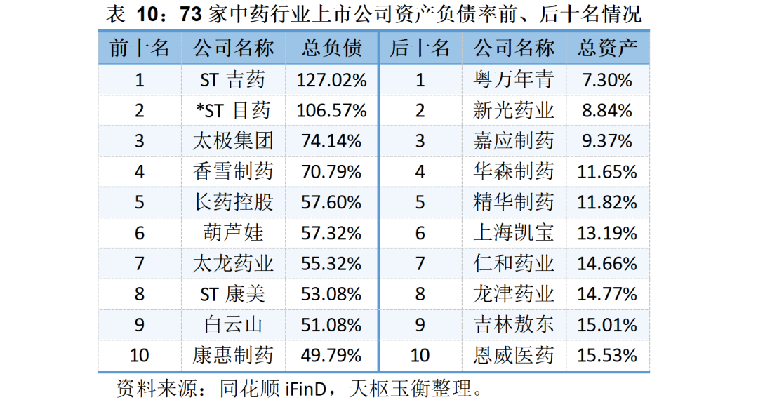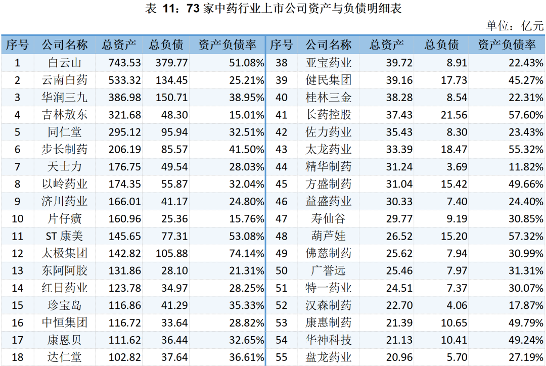 73家中藥上市公司的資產(chǎn)、負債與資產(chǎn)負債率明細表如下所示: