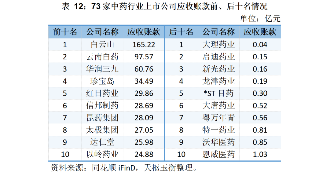 在應收賬款方面,截止2023年9月30日,73家中藥行業(yè)上市公司應收賬款總額為833.55億元,其中白云山的應收賬款余額為165.22億元,云南白藥97.57億元,華潤三九60.76億元。
