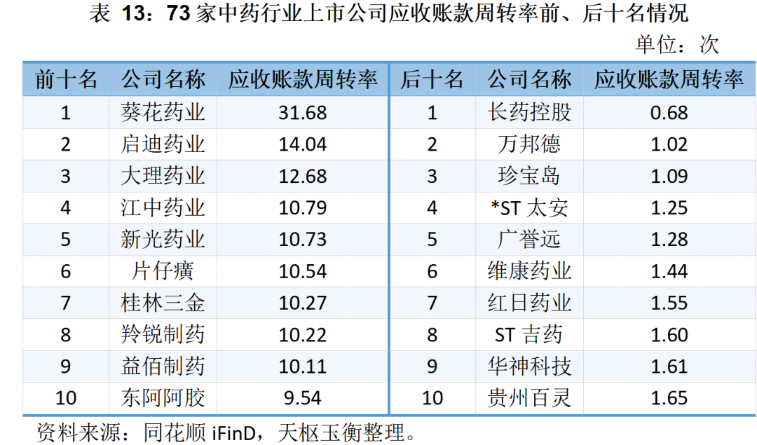 73家中藥行業(yè)上市公司應收賬款及應收賬款周轉率明細表如下所示: