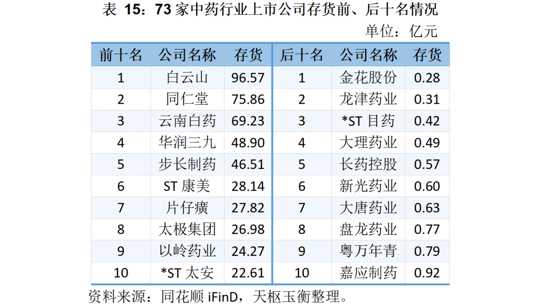在存貨方面,截止2023年9月30日,73家中藥行業(yè)上市公司存貨總額776.11億元,其中存貨最高的三家公司分別為白云山(96.57億元)、同仁堂(75.86億元)和云南白藥(69.23億元)。