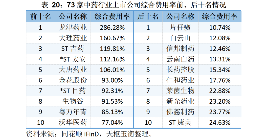 但結合企業(yè)收入規(guī)模來看,片仔癀、白云山、信邦制藥和云南白藥的綜合費用率均為超過15%,綜合費用率較低;反觀龍津藥業(yè)、大理藥業(yè)、ST吉藥、*ST太安和大唐藥業(yè)的營業(yè)收入都不足以支撐其費用支出。