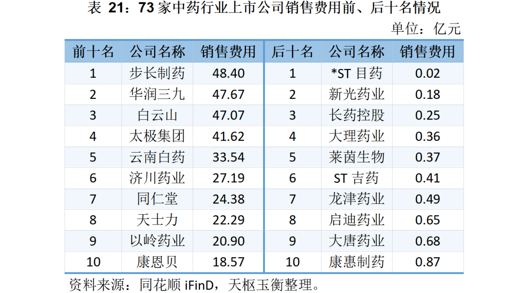 銷售費用方面,步長制藥、華潤三九、白云山和太極集團的銷售費用均超過了40億元,云南白藥亦支付了33億元的銷售費用。