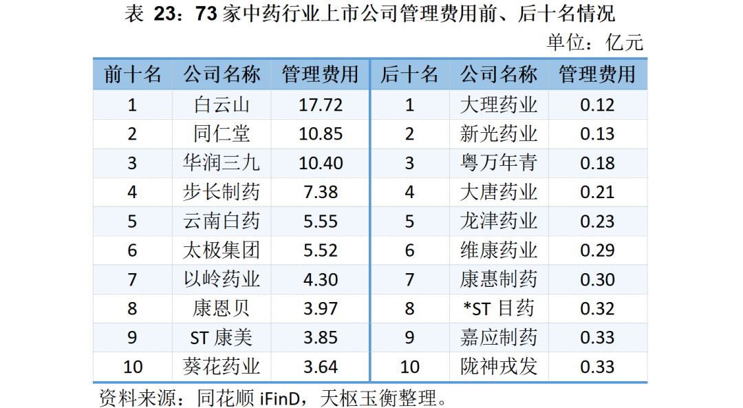 管理費用方面,僅白云山、同仁堂和華潤三九的管理費用破10億元,分別為17.72億元、10.85億元和10.40億元。
