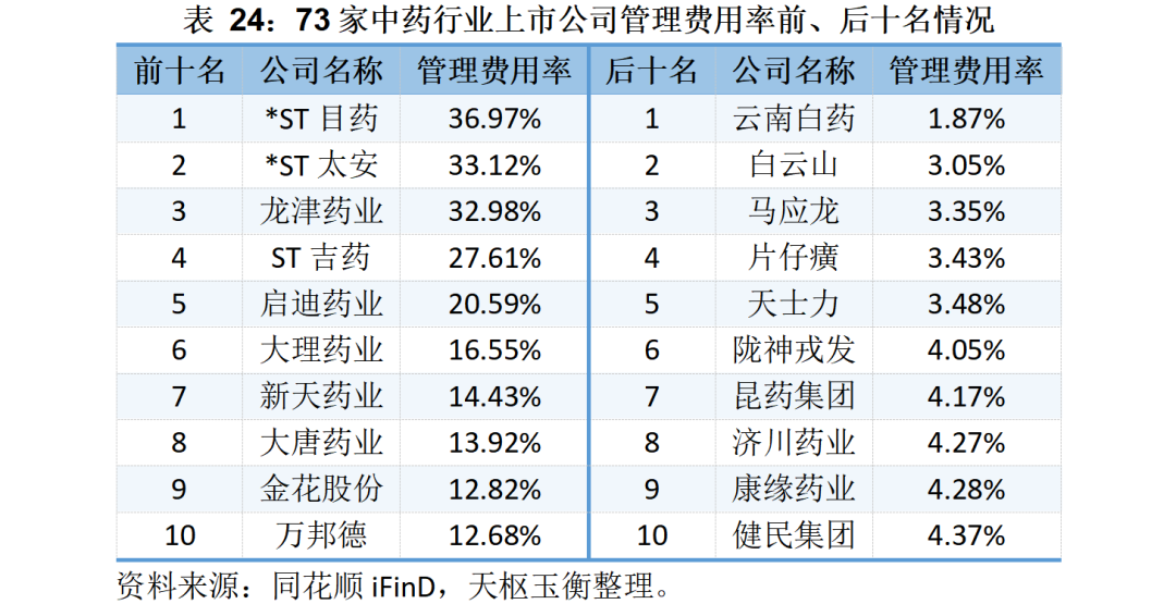 云南白藥雖然支付了5.55億元的管理費用,但綜合來看其管理費用率僅1.87%,是73家中藥上市公司中管理費用率最低的企業(yè)。