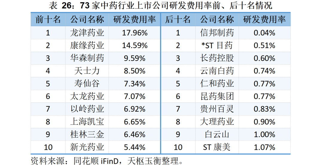 從研發(fā)費用率來看,龍津藥業(yè)和康緣藥業(yè)的研發(fā)費用率超10%;云南的另外三家中藥上市公司——云南白藥、昆藥集團、大理藥業(yè)的研發(fā)費用率則均不足1%。