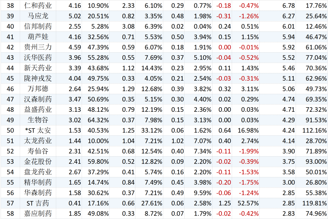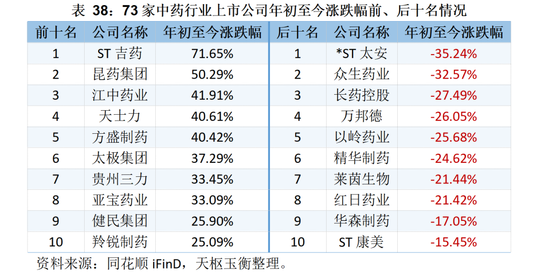 年初至今,中藥行業(yè)上市公司中,共有47家公司收漲,26家公司收跌;其中:ST吉藥漲幅最高,達到71.65%,其次為昆藥集團,年初至今累計上漲50.29%;*ST太安和眾生藥業(yè)則跌超30%。
