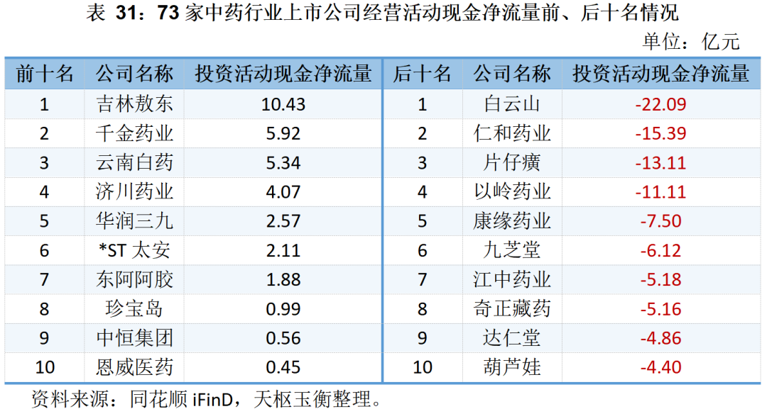 在投資活動現(xiàn)金凈流量方面,僅13家中藥上市公司投資活動現(xiàn)金凈流量為正,白云山、仁和藥業(yè)、片仔癀、以嶺藥業(yè)在2023年前三季度投資活動凈流出22.09億元、15.39億元、13.11億元和11.11億元。