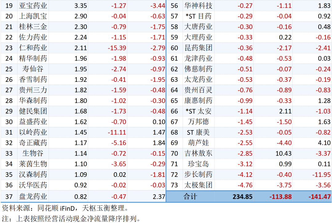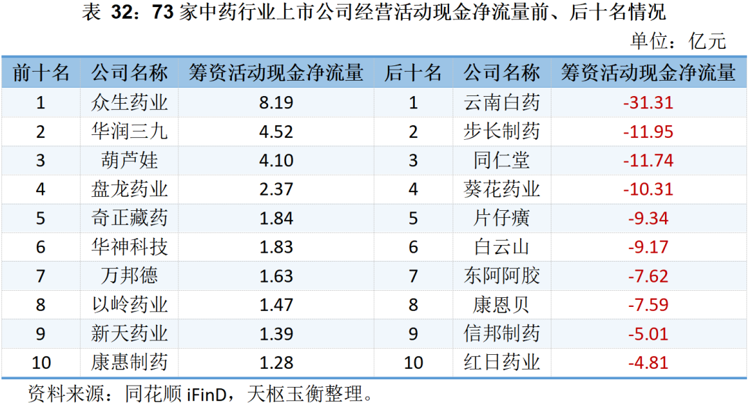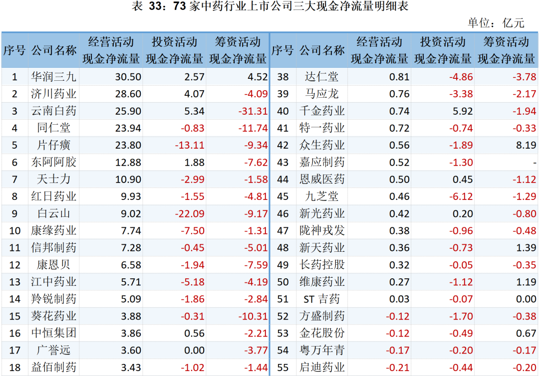 73家中藥行業(yè)上市公司三大現(xiàn)金凈流量明細詳見下表: