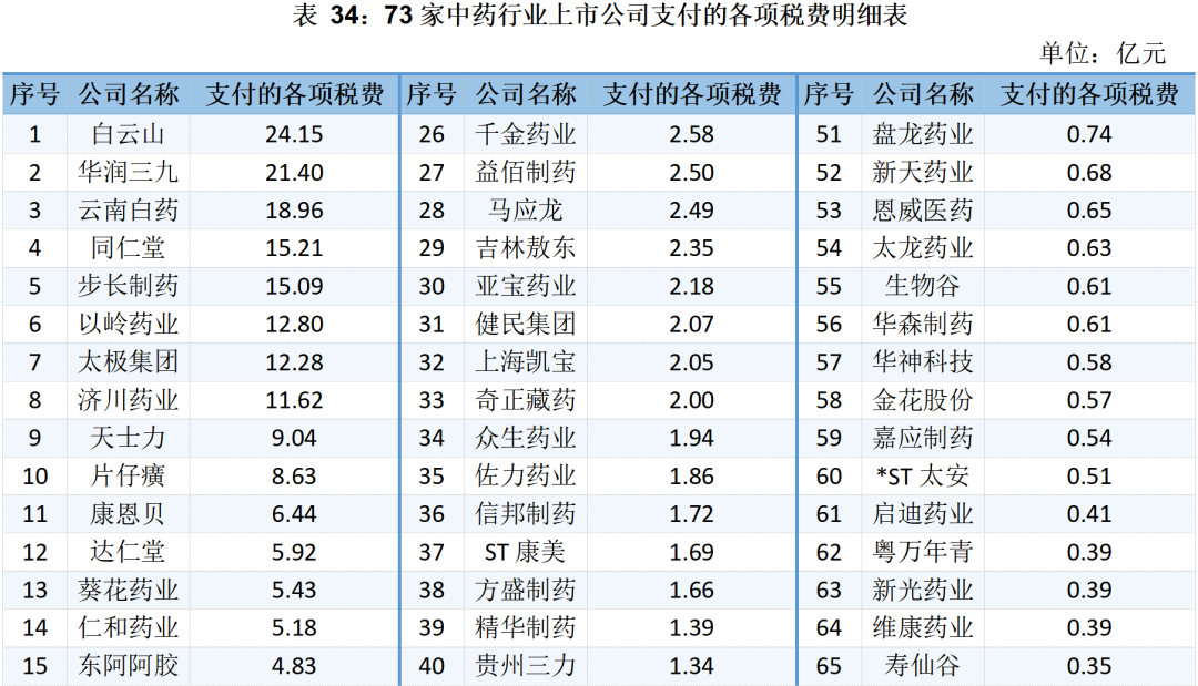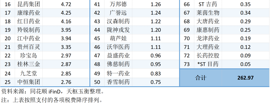 2023年前三季度,73家中藥行業(yè)上市公司累計支付各項稅費262.97億元。其中:
