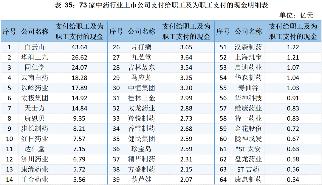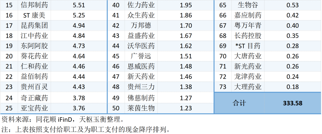 2023年前三季度,73家中藥行業(yè)上市公司支付給職工及為職工支付的現(xiàn)金累計333.58億元。其中: