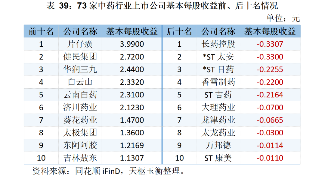 在基本每股收益方面,片仔癀基本每股收益為3.99元,健民集團、華潤三九、白云山、云南白藥和濟川藥業(yè)的基本每股收益也都超過2元;長藥控股、*ST太安等10家中藥企業(yè)的基本每股收益為負。