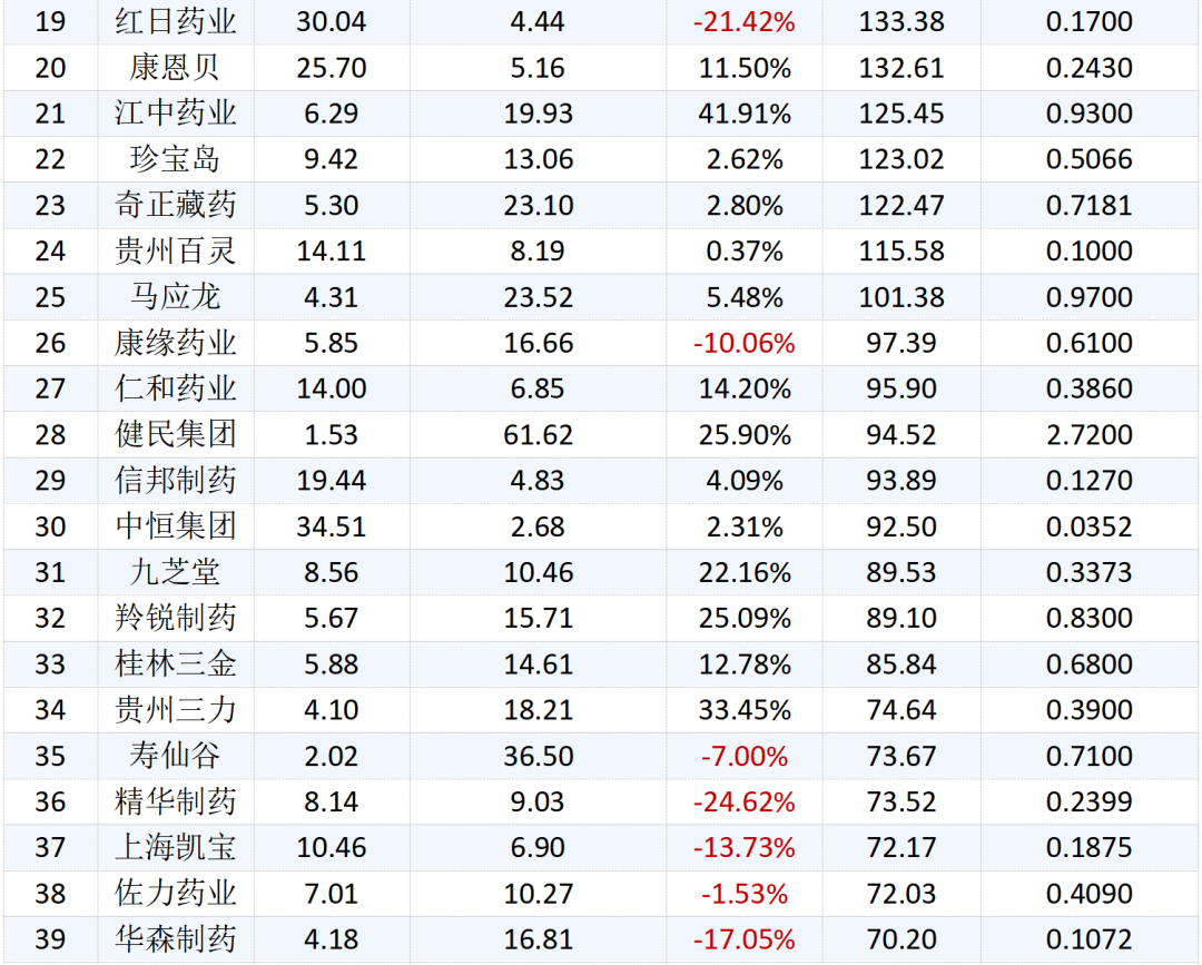 在收盤價方面,片仔癀是唯一股價破百的公司,截止11月2日收盤,片仔癀的收盤價為249.80元/股;健民集團以61.62元/股的收盤價位居第二,同仁堂、云南白藥分別以51.37元/股和50.87元/股緊隨其后;另有29家公司股價不足10元/股。