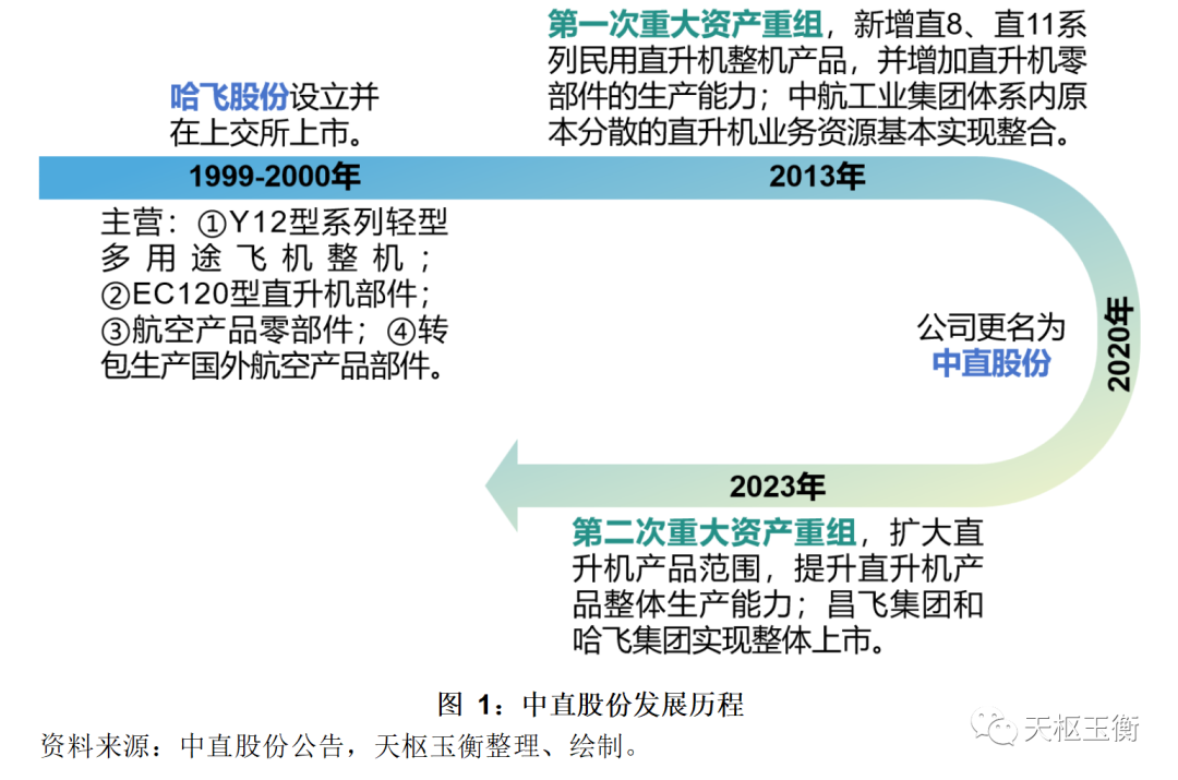 中直股份2001年上市,2013年發(fā)行股份整合航空工業(yè)集團(tuán)直升機(jī)整機(jī)及零部件生產(chǎn)相關(guān)的資產(chǎn);2023年擬發(fā)行股份購買昌飛集團(tuán)和哈飛集團(tuán)100%股權(quán),實(shí)現(xiàn)航空工業(yè)集團(tuán)直升機(jī)板塊的整體上市。