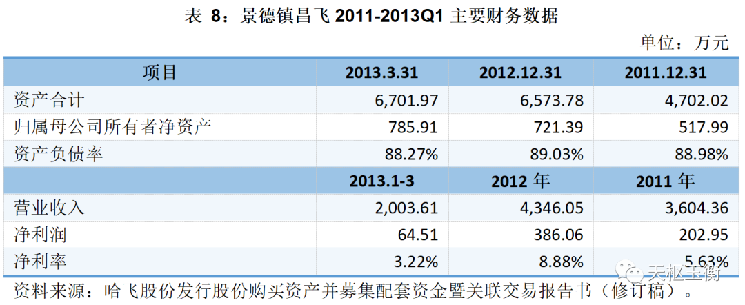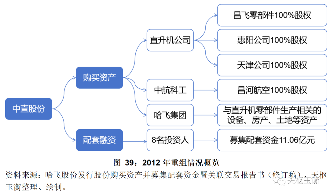 2013年,哈飛股份按照16.87元/股的價(jià)格,向中航直升機(jī)有限責(zé)任公司、中國航空科技工業(yè)股份有限公司、哈爾濱飛機(jī)工業(yè)集團(tuán)有限責(zé)任公司合計(jì)發(fā)行196,826,716股股份,以總交易價(jià)格332,046.67萬元向直升機(jī)公司購買其持有的景德鎮(zhèn)昌飛航空零部件有限公司100%股權(quán)、惠陽航空螺旋槳有限責(zé)任公司100%股權(quán)、天津直升機(jī)有限責(zé)任公司100%股權(quán),向中航科工購買其持有的江西昌河航空工業(yè)有限公司100%股權(quán),向哈飛集團(tuán)購買其持有的與直升機(jī)零部件生產(chǎn)相關(guān)的資產(chǎn)。