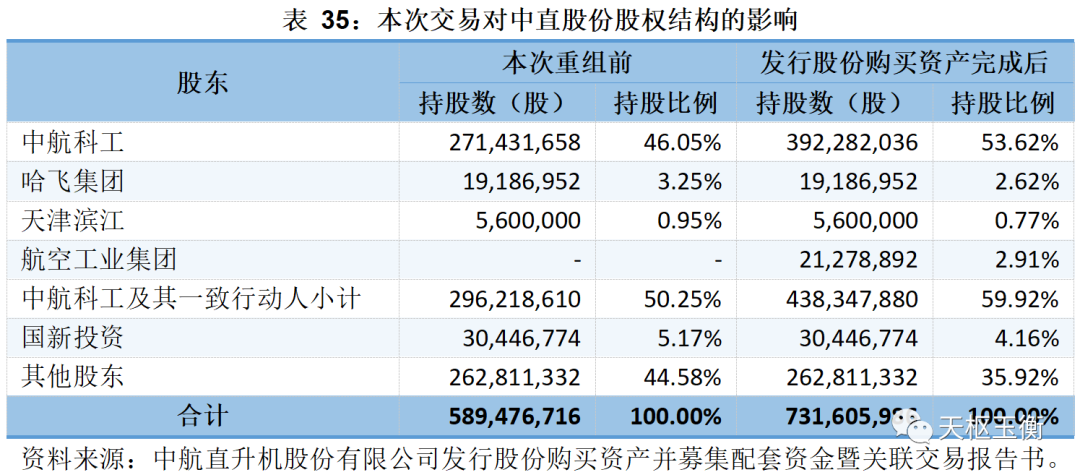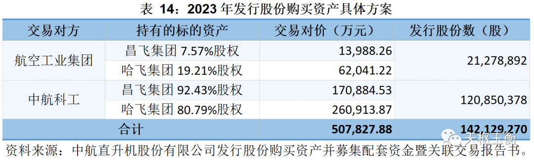 2023年,為進(jìn)一步實(shí)現(xiàn)直升機(jī)業(yè)務(wù)的整合,促進(jìn)上市公司高質(zhì)量發(fā)展,中航直升機(jī)股份有限公司擬按照35.92元/股的價(jià)格,向哈爾濱飛機(jī)工業(yè)集團(tuán)有限責(zé)任公司和中國航空科技工業(yè)股份有限公司合計(jì)發(fā)行142,129,270股股份,以總交易價(jià)格507,827.88萬元購買昌河飛機(jī)工業(yè)(集團(tuán))有限責(zé)任公司和哈爾濱飛機(jī)工業(yè)集團(tuán)有限責(zé)任公司100%股權(quán)并募集配套資金。
