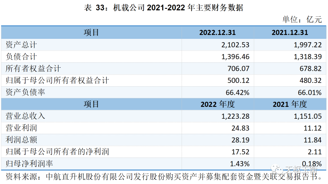 中航科工主營業(yè)務(wù)為防務(wù)產(chǎn)品及民用航空產(chǎn)品的開發(fā)、制造、銷售和改進(jìn),為國內(nèi)外客戶提供直升機(jī)、教練機(jī)、通用飛機(jī)、支線飛機(jī)、航空配套系統(tǒng)等產(chǎn)品及航空工程領(lǐng)域的規(guī)劃、設(shè)計(jì)和咨詢等服務(wù),并與其他航空產(chǎn)品制造商開展合作研發(fā)和生產(chǎn)。2021年及2022年的主要財(cái)務(wù)數(shù)據(jù)(合并報(bào)表)如下表所示: