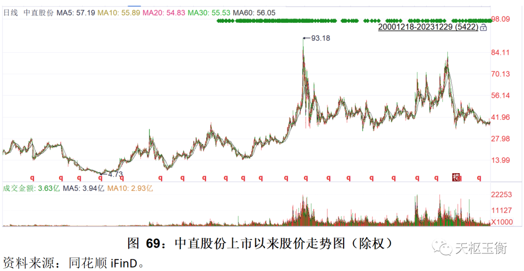 除權(quán)后,中直股份在2015年5月末,達(dá)到了股價(jià)的最高峰,為93.18元/股;截止2023年末,公司股價(jià)收于38.53元/股。
