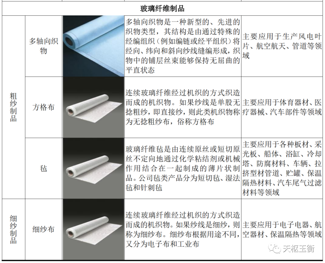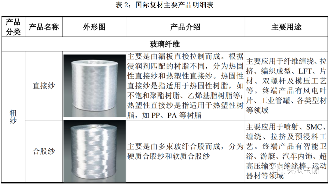 其中,國際復材生產(chǎn)的玻璃纖維均為無堿玻璃纖維,主要產(chǎn)品包括玻璃纖維和玻璃纖維制品兩大類。根據(jù)產(chǎn)品形態(tài)和生產(chǎn)工藝的不同,公司玻璃纖維產(chǎn)品可分為粗紗、細紗、粗紗制品、細紗制品四大類。根據(jù)所匹配基體樹脂材料的不同,公司產(chǎn)品可分為熱固性玻璃纖維和熱塑性玻璃纖維兩大類。