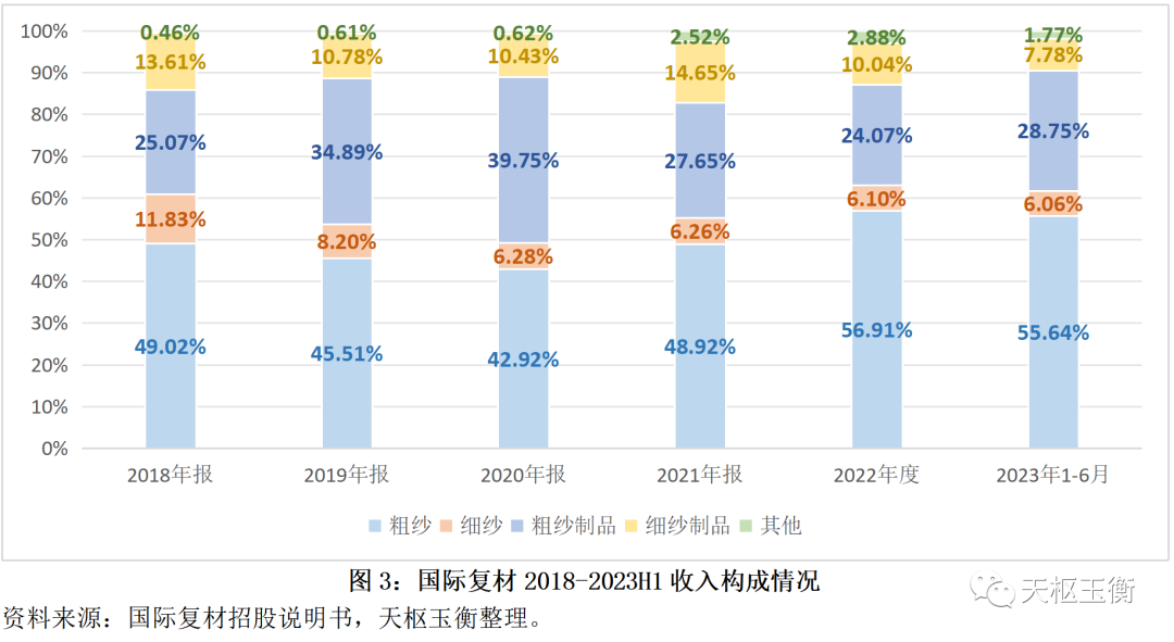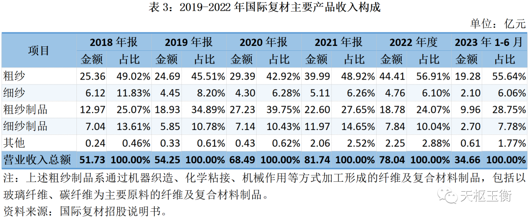 國際復材營業(yè)收入的主要構成部分是粗紗和粗紗制品,其次是細紗制品和細紗。