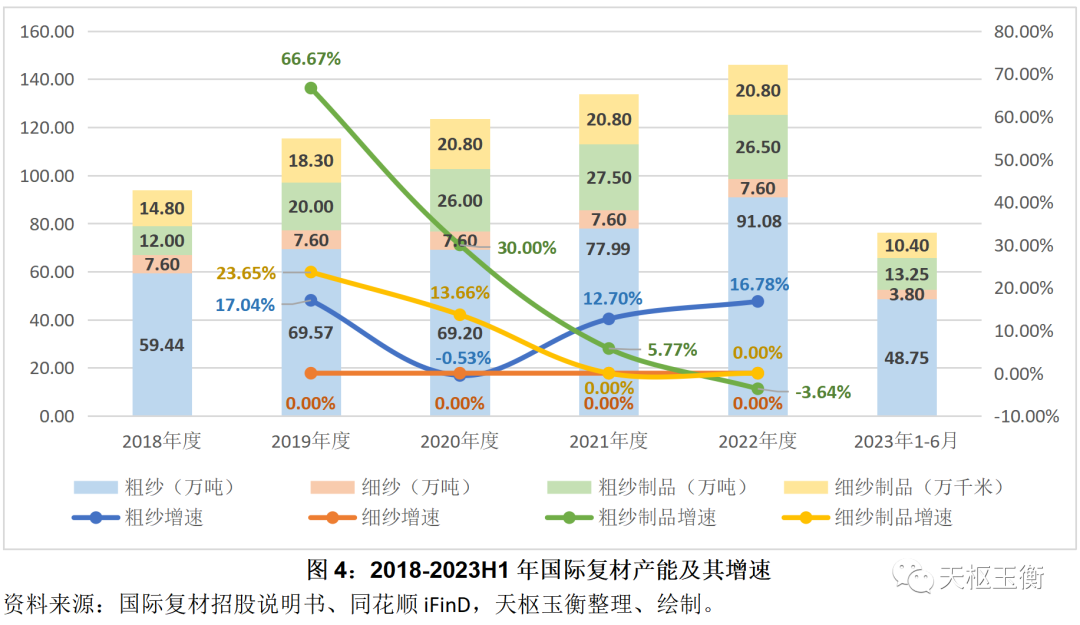 在產(chǎn)能方面,截止2022年末,國際復材粗紗產(chǎn)能為91.08萬噸,細紗產(chǎn)能為7.60萬噸,粗紗制品產(chǎn)能26.5萬噸,細紗制品產(chǎn)能20.80萬千米。