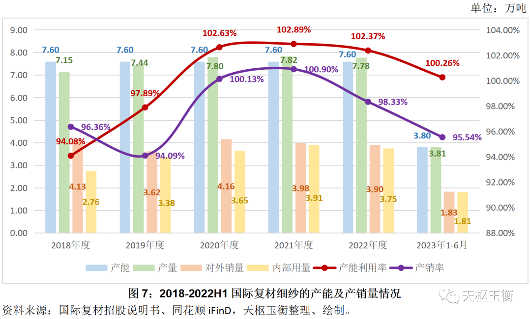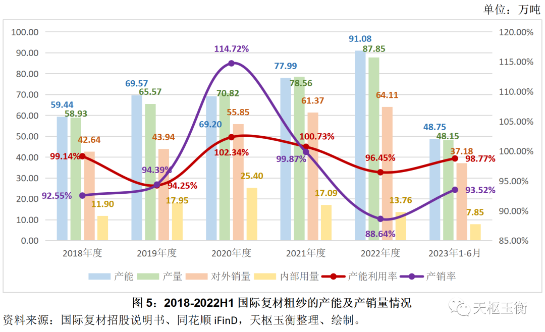 在細紗方面,2022年國際復材生產(chǎn)細紗7.60萬噸,產(chǎn)能利用率為102.37%;銷量7.78萬噸,產(chǎn)銷率達到98.33%,其中對外銷量3.90萬噸,內(nèi)部使用3.75萬噸。