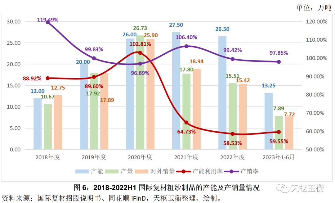 在粗紗制品方面,2022年國際復材生產(chǎn)粗紗制品26.50萬噸,銷量15.51萬噸,產(chǎn)銷率為99.42%。