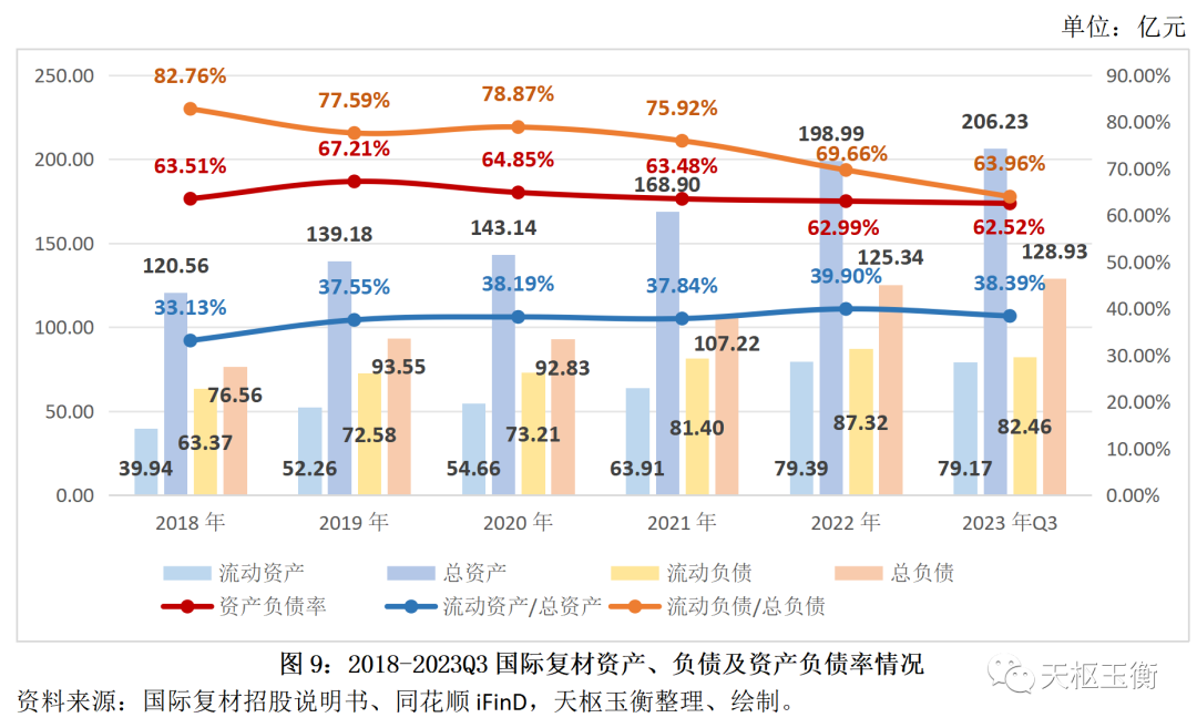 2018年-2023年三季度,國際復材的資產(chǎn)負債率保持在65%左右;流動資產(chǎn)占總資產(chǎn)的比重維持在38%附近,流動負債占總負債的比例的持續(xù)下滑。