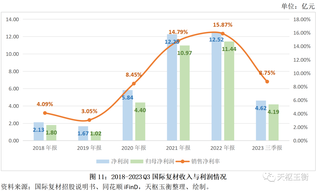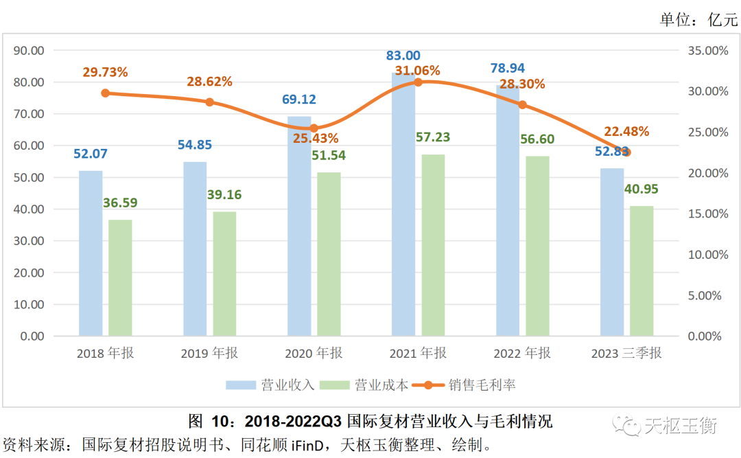 在毛利率方面,除了2020年國際復材的毛利率為25%以外,2018-2022年國際復材的毛利率都一本保持在30%附近;2023年前三季度的毛利率則為22.48%,創(chuàng)下近年來新低。